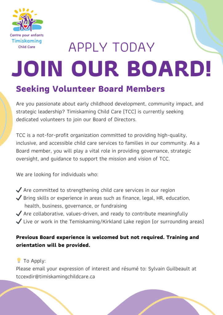 Volunteering with Centre pour enfants Timiskaming Child Care provides opportunities for volunteers to share their skills and/or develop new ones.
